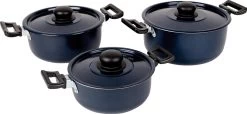 Een 3-delige pannenset. Deze kookpannen zijn gemaakt van lichtgewicht aluminium. Daarnaast is iedere pan voorzien van comfortabele en hittebestendige handgrepen, een anti-aanbaklaag en een deksel. Te gebruiken op de warmtebron gas. Afmetingen (Øxh): 20×9,5, 18×8,5 en 16×7,5 cm. Inhoud: 1,4, 2 en 2,8 liter.