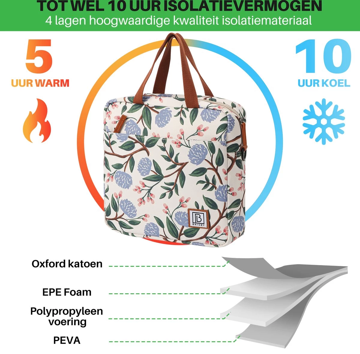 Brisby 4 Laags Geïsoleerde Koeltas – Lunchtas 7 liter – Witte Bloem – Lunchtas voor onderweg – Inclusief schouderband – 2 gratis koelelementen van 200 ML.
