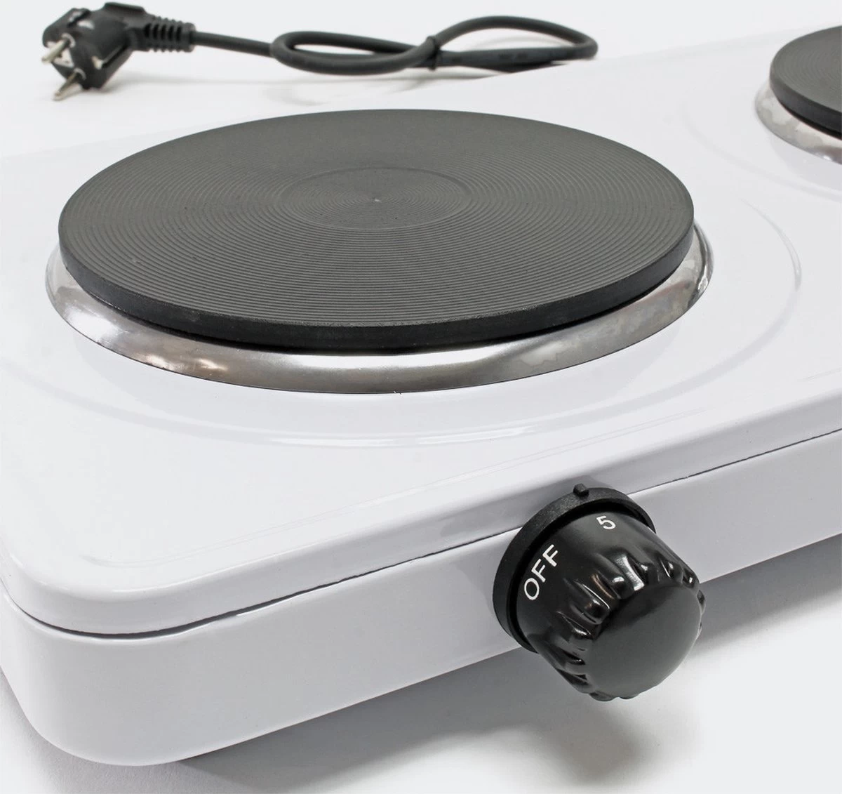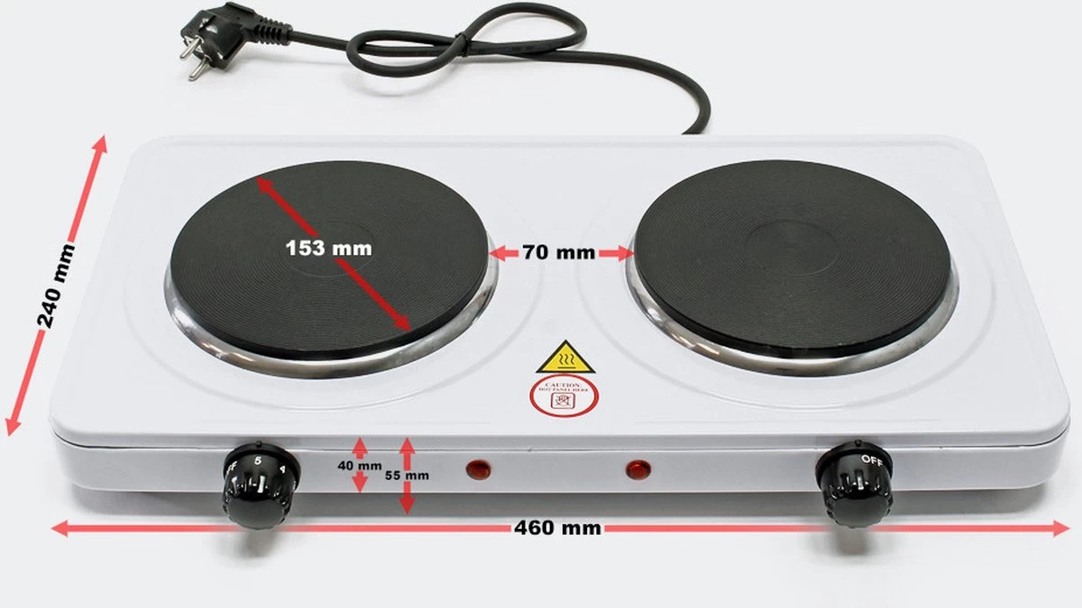 Universele dubbele kookplaat, ideaal voor gebruik in huis, tuin en kampeertochten. Met dit draagbare kooktoestel bereid u waar dan ook eenvoudig uw warme maaltijd. Met een 230V aansluiting kunt u met 2 pannen tegelijk koken op deze 2 pits kookplaat.