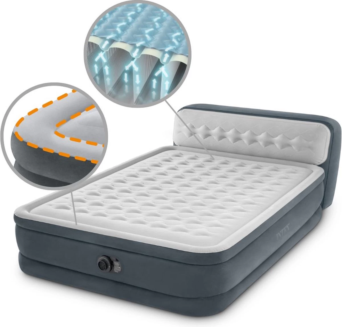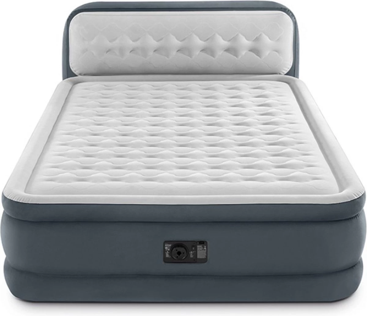 Dit Dura-Beam Deluxe serie Ultra Plush Headboard luchtbed 64448NP van Intex met ingebouwde, elektrische pomp is aanzienlijk sterker, lichter en comfortabeler dan conventionele luchtbedden en biedt een stressvrije slaapervaring.