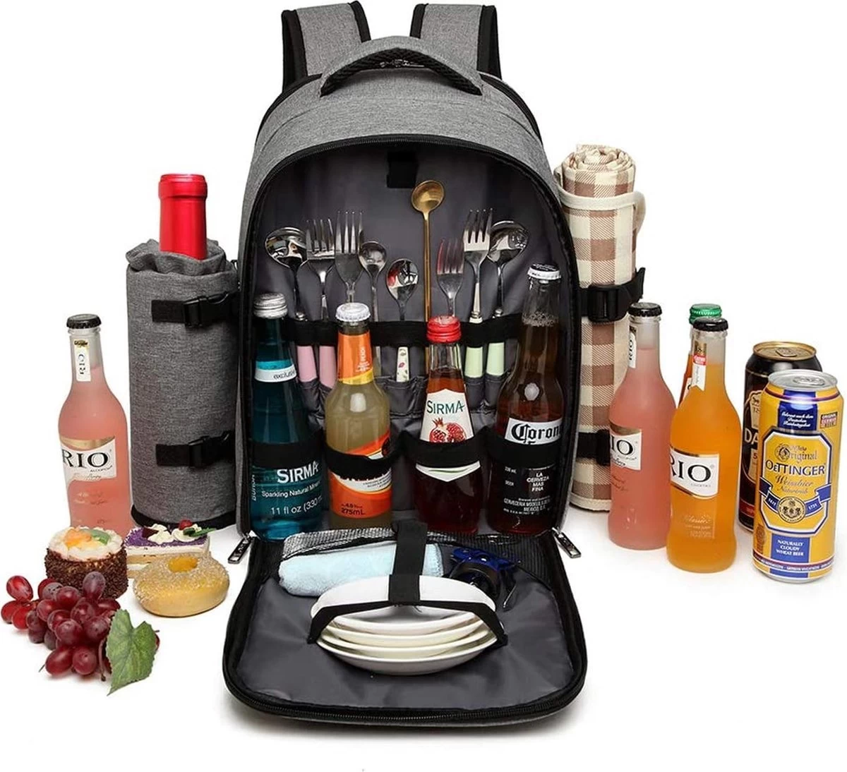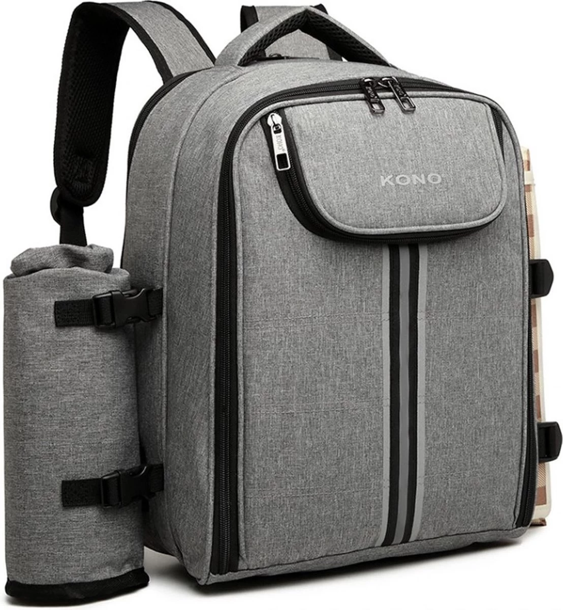 Het grote compartiment van deze Kono picknick rugtas heeft een isolerende voering waardoor etenswaren perfect vers en koel blijven. De zijkanten van deze backpack zijn voorzien van een afneembare houder voor het meegeleverde picknickplaid. Deze bevestig en verwijder je eenvoudig door middel van een gespsluiting met klittenband. Aan de andere zijde van deze rugtas vind je een fles houder die tevens afneembaar is. De bovenkant van deze backpack heeft een stevig handvat om de picknicktas makkelijk te kunnen verplaatsen. De schouderbanden zijn ruim verstelbaar en zacht gevoerd. Deze rugtas van Kono is vervaardigd van waterdicht en hoogwaardig textiel.