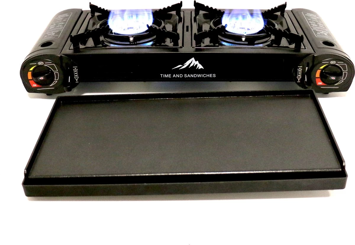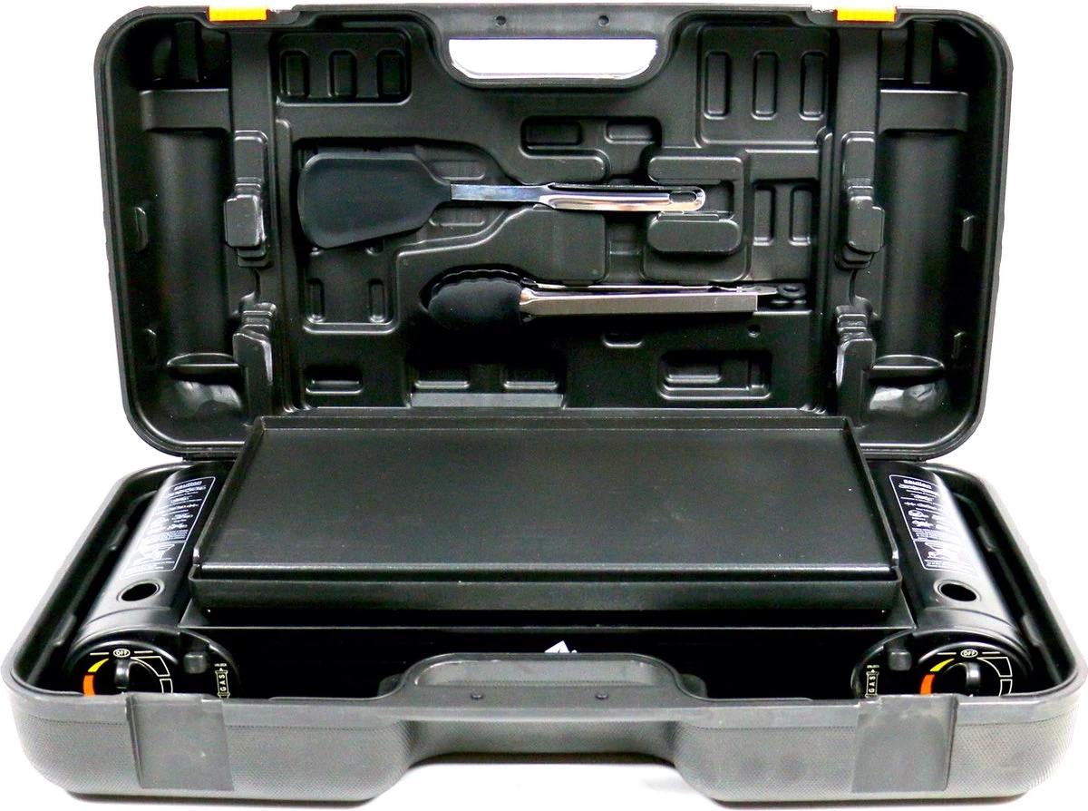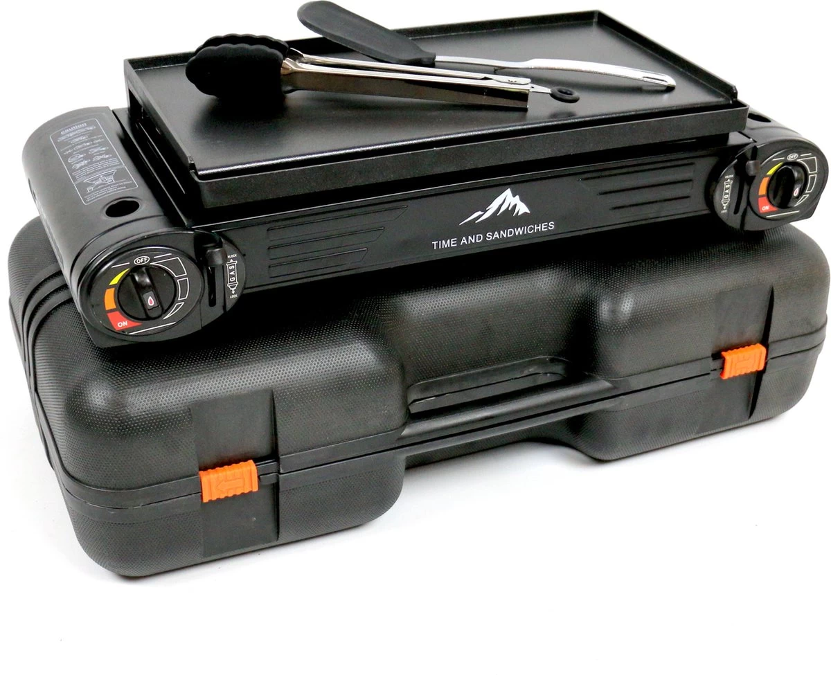 T&S – Draagbaar Dubbel Gasvuur Met Grillplaat En Transportkist – Camping Kooktoestel – Kookstel – Bakplaat – Gasfornuis – 2 Pits – Elektrische Ontsteking – Kookvuur – Kampeer Vuur