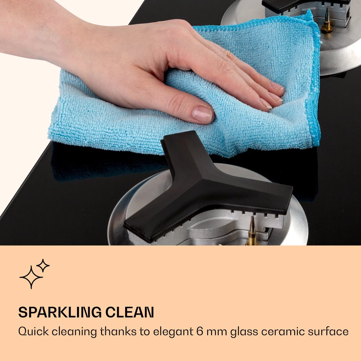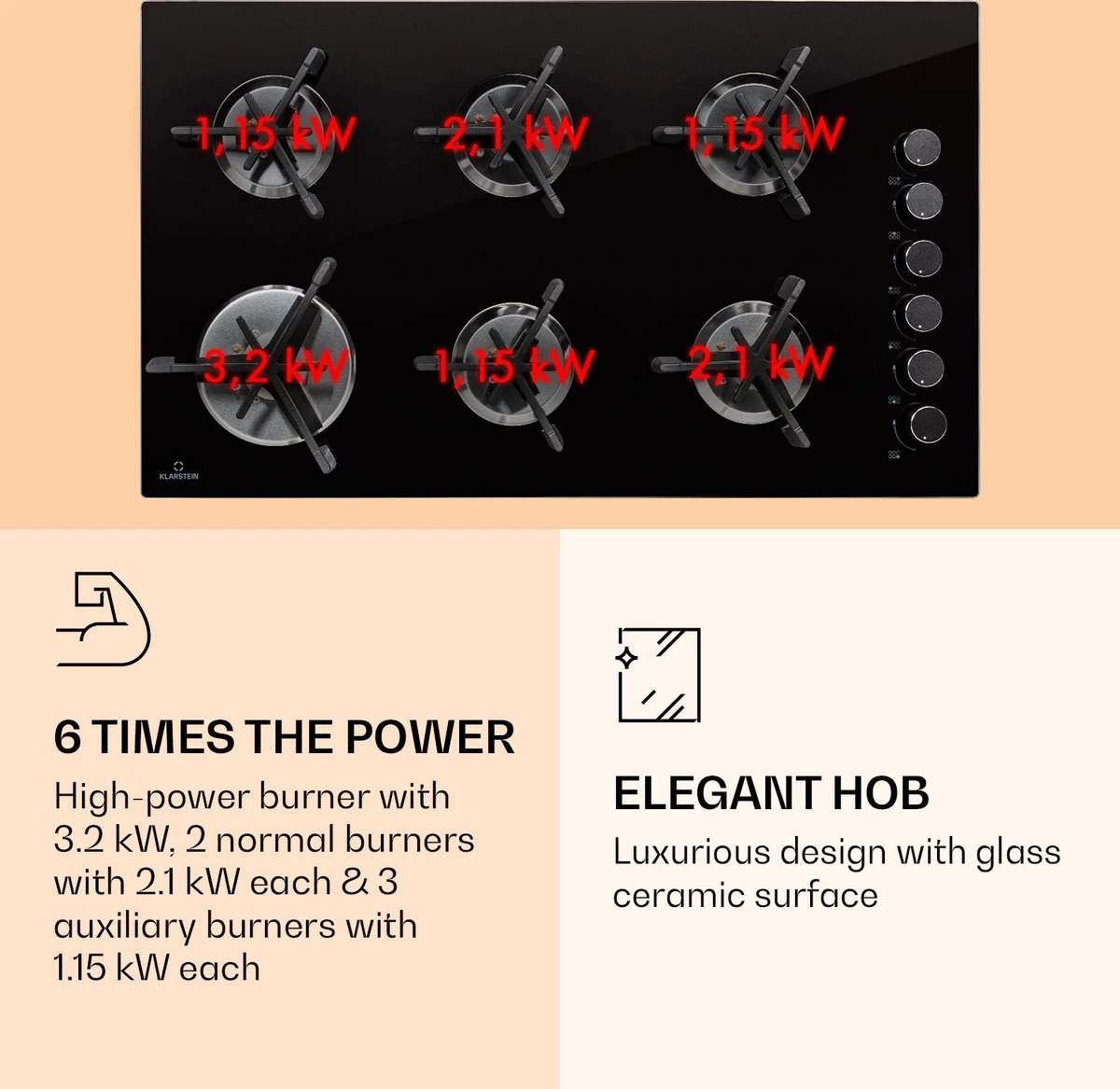 De Klarstein Trifecta 6 gaskookplaat bekoort in de eerste plaats door zijn driehoekige branders met bijzonder robuuste pannendragers van gietijzer. Door het driearmige ontwerp sturen deze warmte door sterk geconcentreerde vuurbronnen die bij het koken overtuigen door hun effiociëntie en snelheid. De exclusieve gaskookplaten zijn ingebouwd in een glaskeramisch veld met een dikte van 6 mm, waaronder de robuuste roestvrijstalen behuizing zicht bevindt. Met een vermogen van 3,2 kW verwarmt de grote brander de pannen op de gietijzeren pannendrager, terwijl 2 normale branders met elk een vermogen van 2,1 kW en de 3 extra branders met elk 1,15 kW het volle vermogen realiseren. Om de Trifecta 6 aan te steken is geen extra aansteker nodig, omdat het gasfornuis is voorzien van een elektrische ontsteking. De warmtetoevoer is heel eenvoudig te regelen via de draaiknop. 6-voudige efficiëntie, snelheid en energiebesparing: das Klarstein Trifecta 6 gaskookplaat met driehoekige branders.